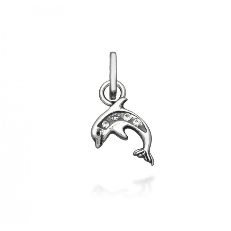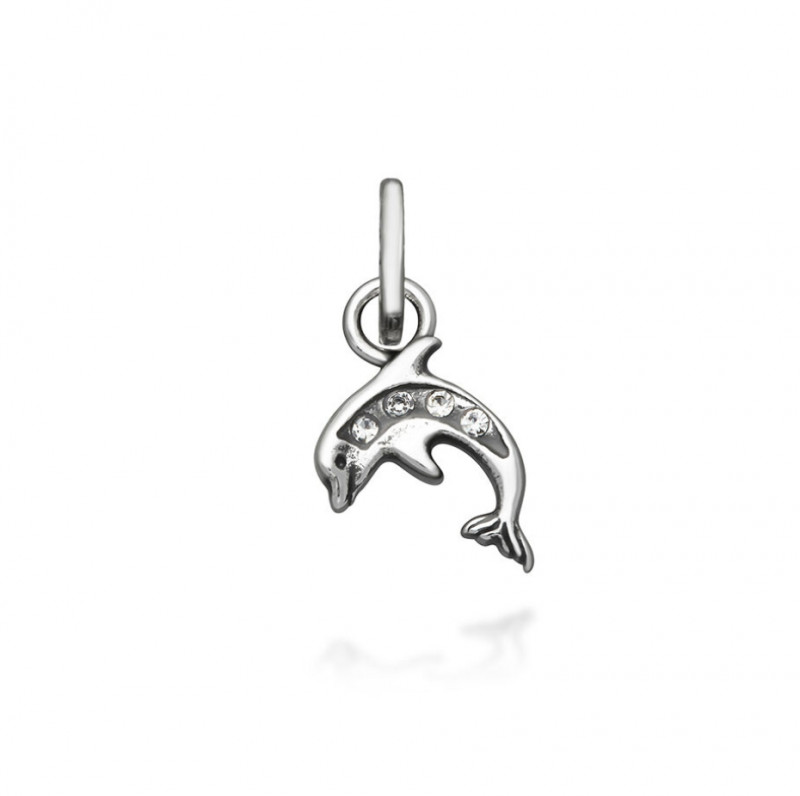 Indossa l'eleganza del mare. Crea il tuo gioiello con un mini charm in argento a forma di delfino realizzato completamente a mano in azienda. Con una luminosità sorprendente, amplificata ancor più dai micro-zirconi trasparenti montati con effetto pavé.