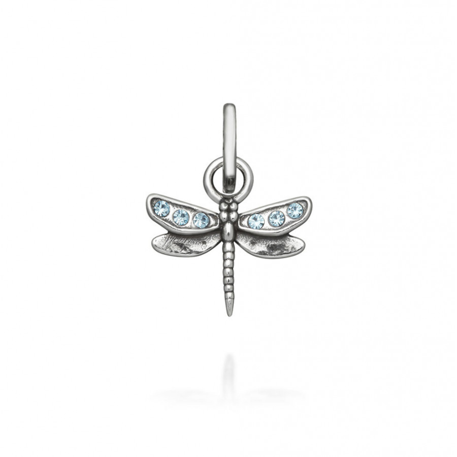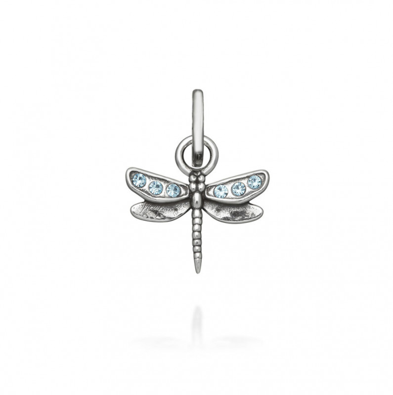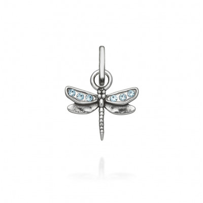 Delicata eleganza per un mini charm in argento a forma di libellula realizzato completamente a mano in azienda. Con una luminosità sorprendente, amplificata ancor più dai micro-zirconi color celeste montati con effetto pavé.