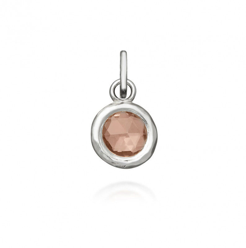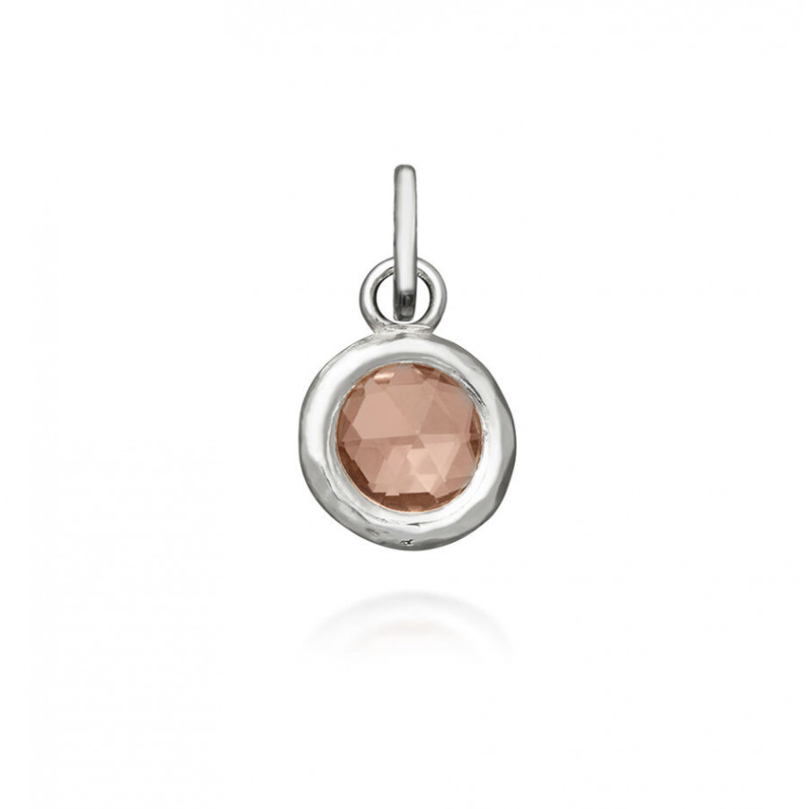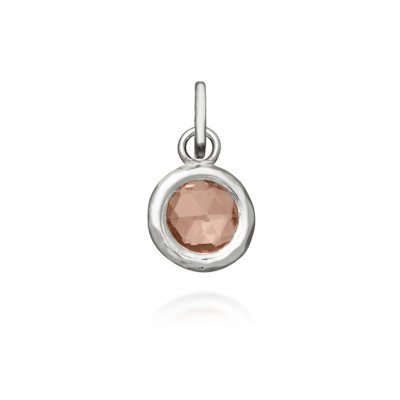 Eleganza in miniatura. Charm dotato di un brillante cristallo cipria sfaccettato, racchiuso in una delicata fascetta in argento. Ogni pezzo è realizzato a mano in azienda, offrendo un tocco di perfezione e unicità.