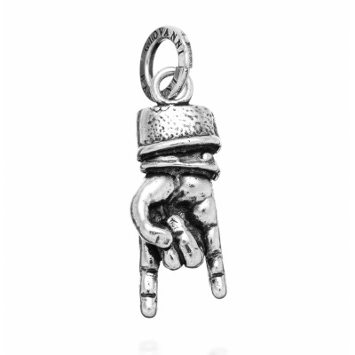 Un piccolo charm in argento portafortuna con una mano con le corna