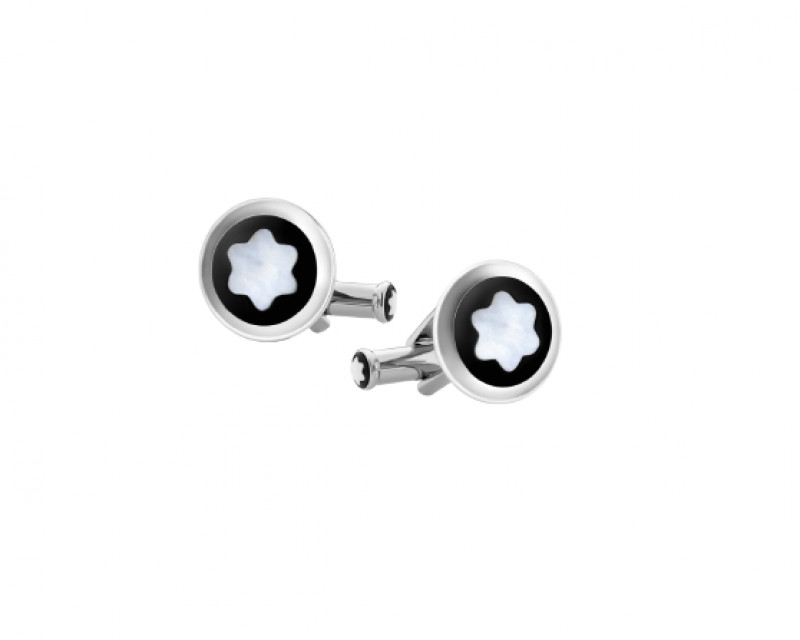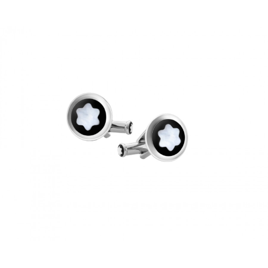 Gemelli Montblanc rotondi in acciaio pregiato con inserto in PVD nero ed emblema della vetta innevata in madreperla collezione Star.