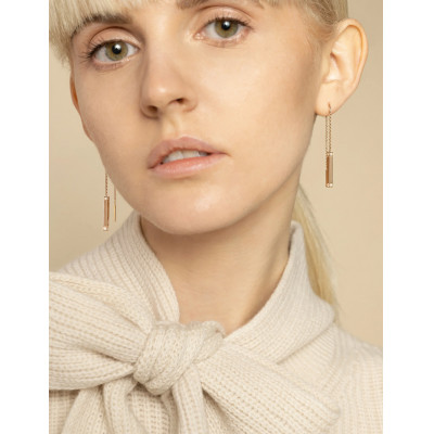 Un orecchino di design con doppia catena e parallelepipedo in oro rosa massiccio. Linee geometriche e essenziali per chi desidera un gioiello da indossare tutti i giorni ma con un tocco distintivo per rendere unico il proprio outfit.