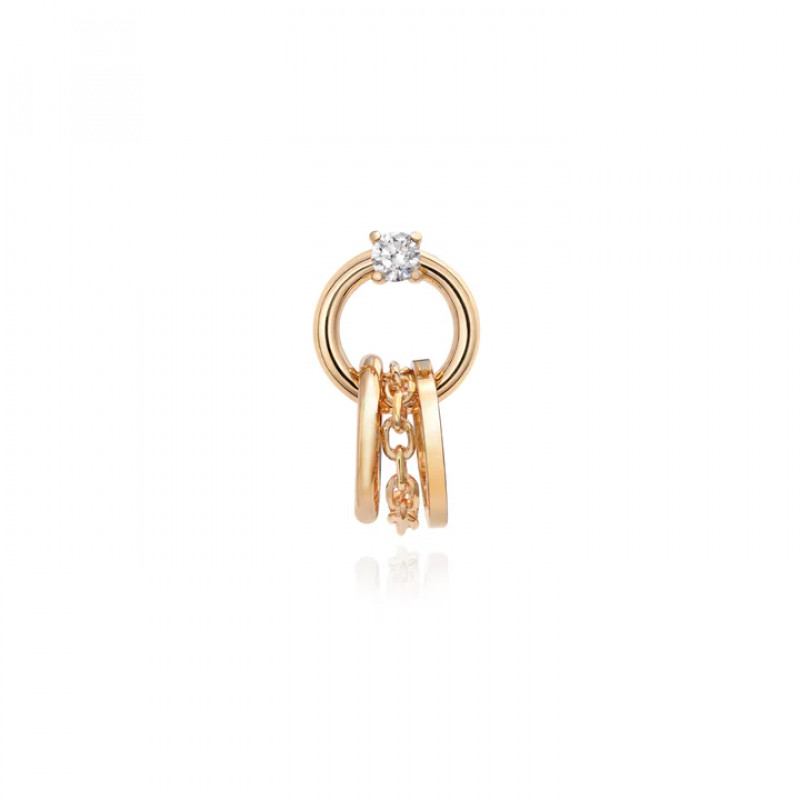 L’orecchino in oro giallo 18 carati racchiude un diamante solitario nel cuore di un cerchio d’oro, dove scorrono tre fedine mobili: una tonda, una catena a finitura diamantata e una squadrata. Un design fluido e luminoso che riflette equilibrio, movimento e stile contemporaneo. Un gioiello dallo charme sofisticato e dal carattere deciso.