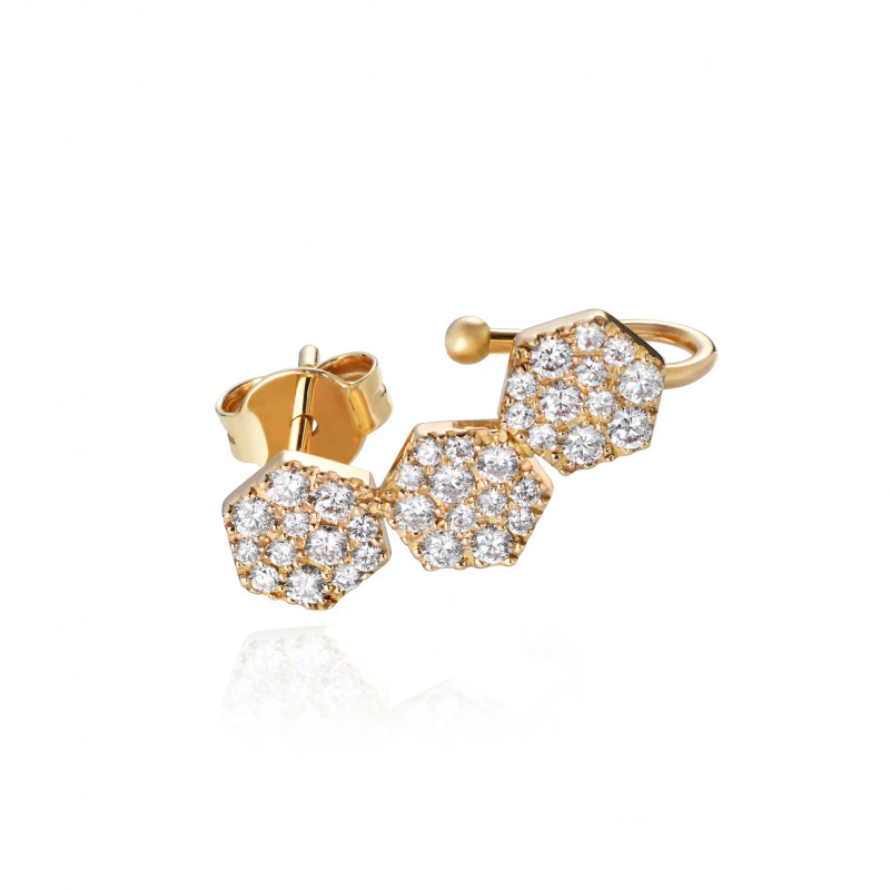 Orecchino Burato Gioielli sinistro in oro giallo 18 kt e tre esagoni di diamanti della collezione Amuleto.