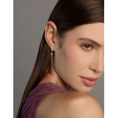 Un equilibrio di luce e movimento: l’orecchino in oro bianco 18 carati con cerchio di diamanti e catenella pendente con diamante charm riflette eleganza e modernità. Ogni diamante racconta la bellezza della semplicità in una danza di bagliori sofisticati.