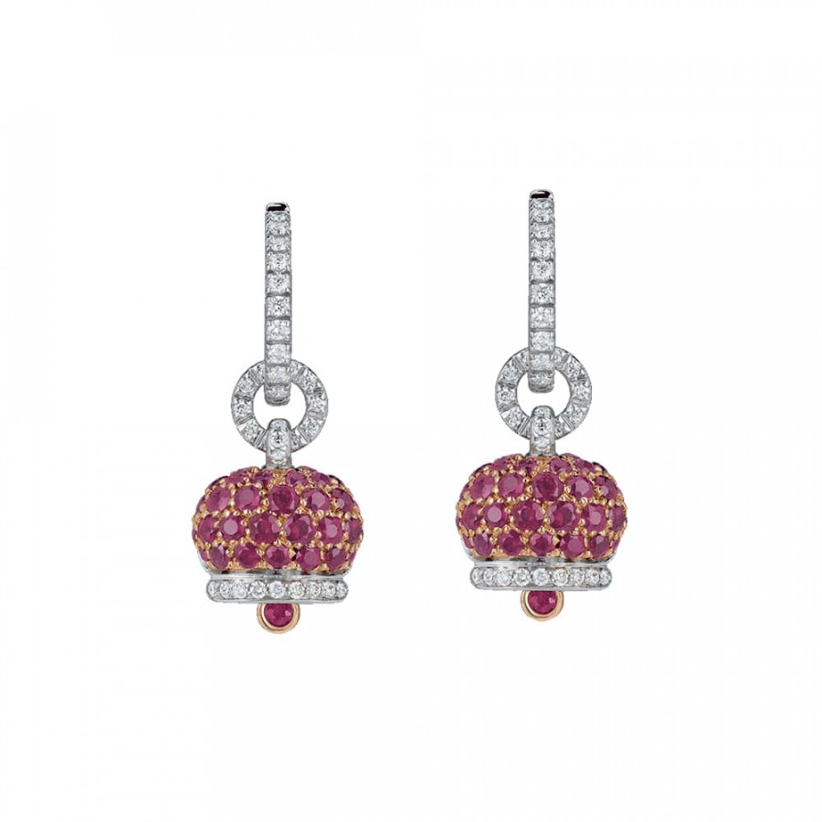 Orecchini Chantecler Campanella piccoli in oro rosa e bianco 18k con diamanti e pavè di rubini della collezione Campanelle