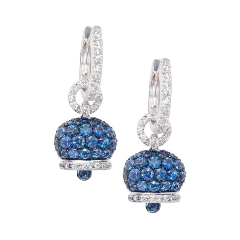Orecchini Chantecler Campanella piccola in oro bianco, diamanti e pavé di zaffiri, appartenente alla collezione Campanelle.