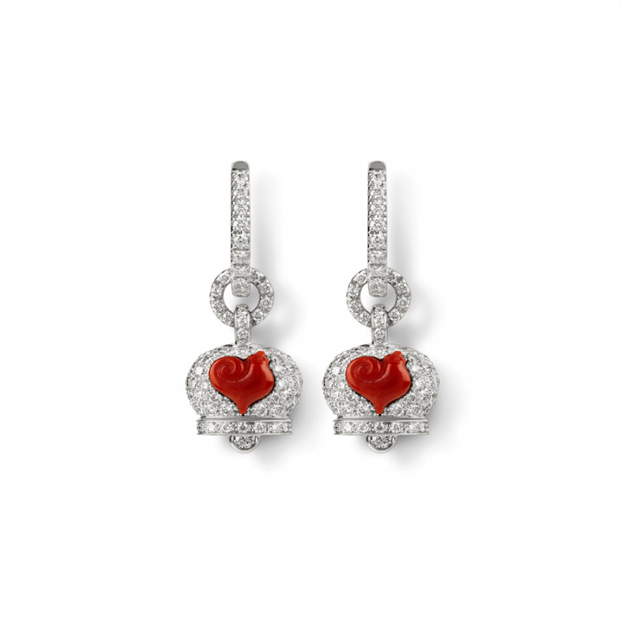 Orecchini Chantecler Campanella micro in oro bianco 18Kt, pavé diamanti bianchi e galletto corallo rosso.