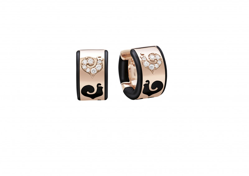 Orecchini a cerchietto Carousèl in oro rosa 18kt, galli in pavé di diamanti e smalto nero di Chantecler della collezione Paillettes.