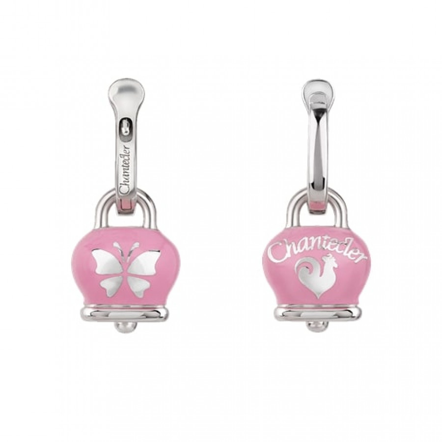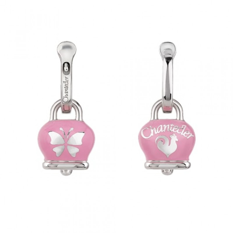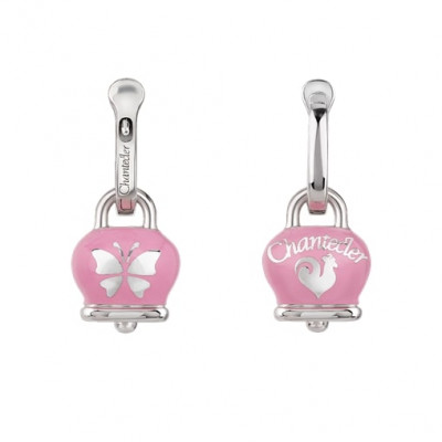 Orecchini Chantecler Campanelle piccoli in argento e smalto rosa con farfalle sul retro, appartenente alla collezione Et Voilà.