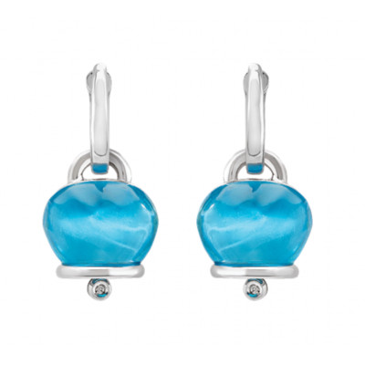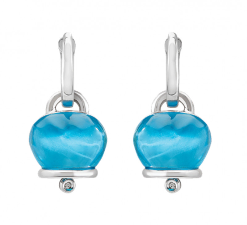 Orecchini Chantecler Campanelle piccoli in argento, rresina sfaccettata a mano color topazio azzurro e due diamanti, appartenente alla collezione Et Voilà.