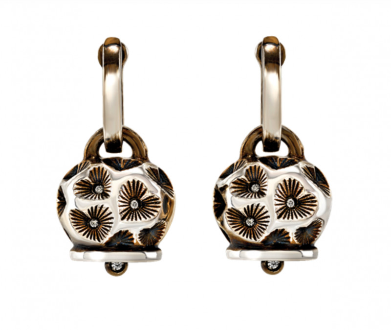 Orecchini Chantecler Campanella medi con cuori incisi a mano in argento invecchiato e diamanti taglio brillante, appartenente alla collezione Et Voilà.