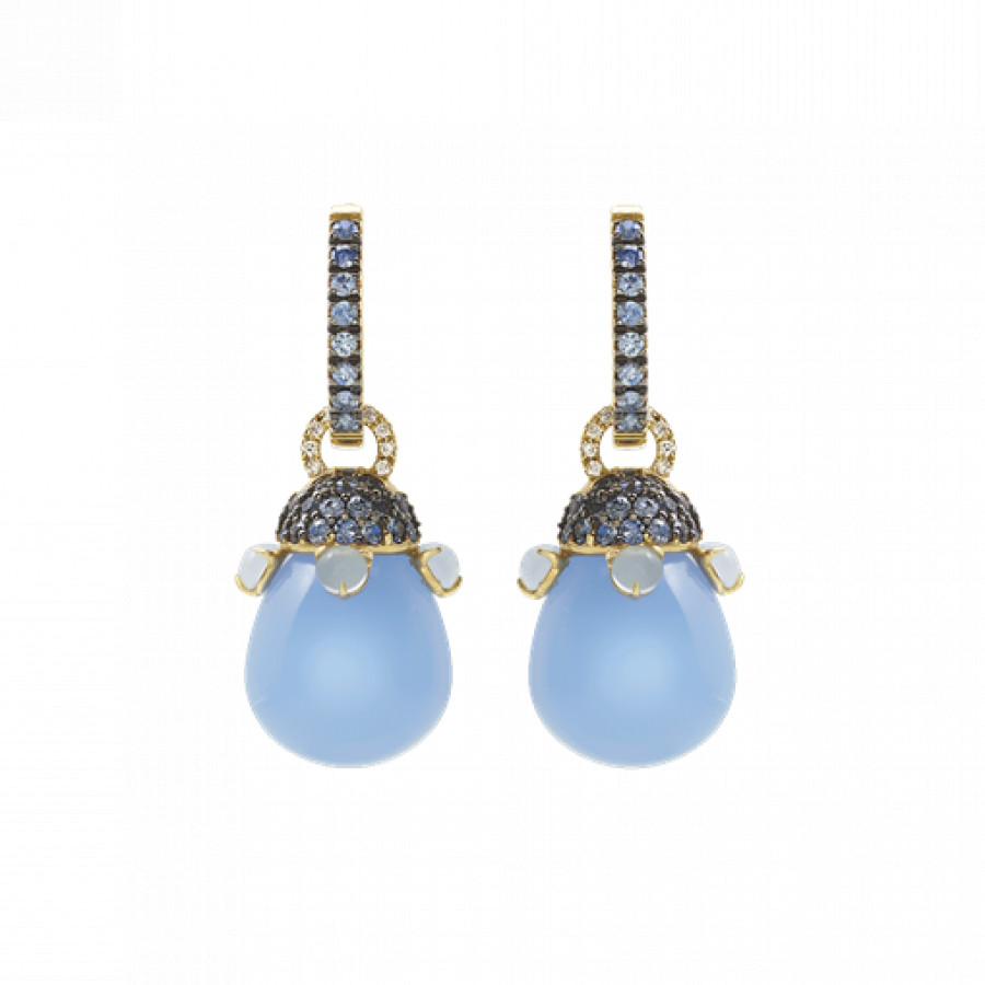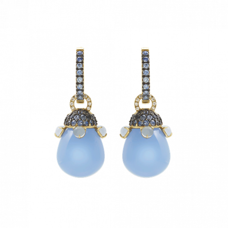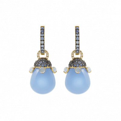 Orecchini in oro giallo 18 Kt, diamanti, zaffiri azzurri e poire in cristallo color glicine di Chantecler della collezione Joyful.