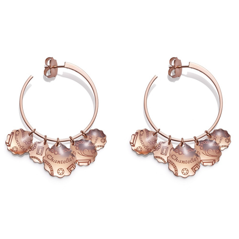 Orecchini Chantecler cerchi grandi multicharms in oro rosa 9Kt e smalto trasparente, appartenente alla collezione Suamèm.