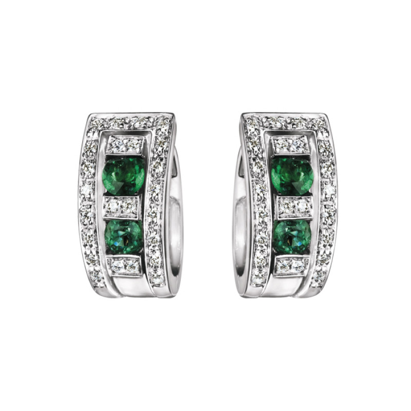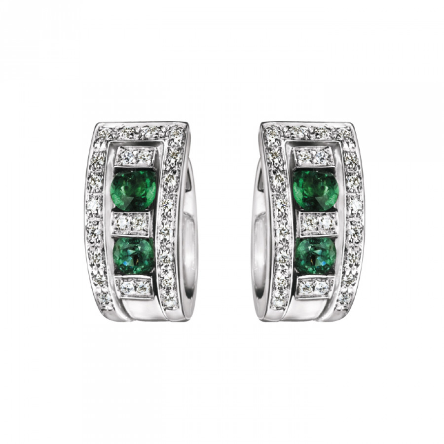 Orecchini in oro bianco 18 carati e diamanti 0,52 ct. H taglio rotondo e smeraldi ct. 0,02