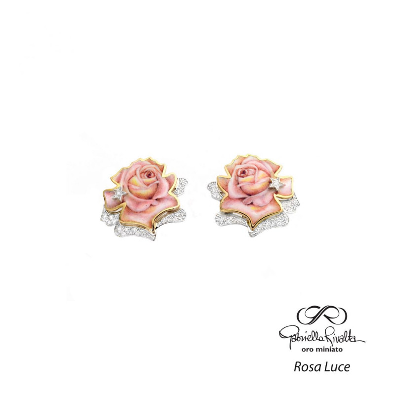 Orecchini in oro bianco 18kt Rosa Luce. La Rosa è finemente dipinta a mano con la tecnica dello smalto a gran fuoco ed ha un punto luce a stella in oro bianco con diamante. La Rosa è adagiata su un pavè di diamanti che rende questa creazione luminosa e preziosa.