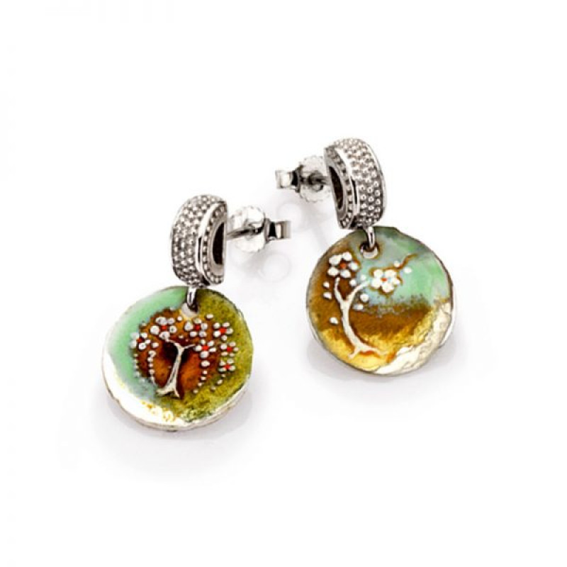Orecchini in Argento 925 Albero della Vita modellato a fiamma, rodiato e smalti a gran fuoco, diametro 15mm