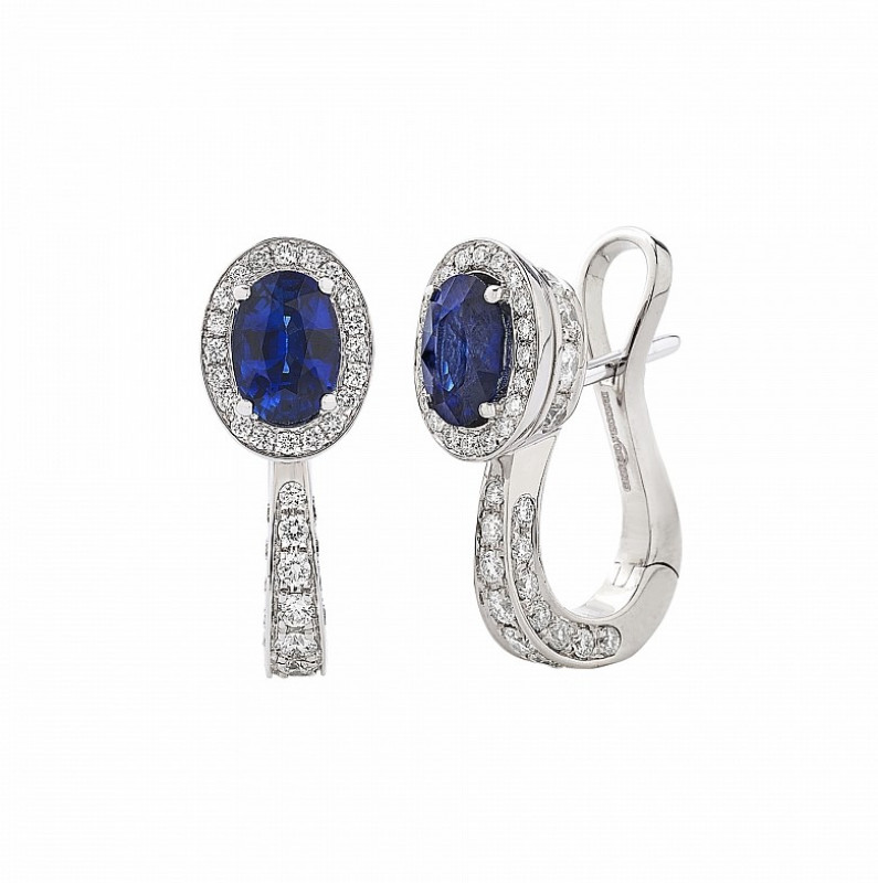 Giorgio Visconti orecchini solitario in oro bianco e zaffiri centrali taglio ovale con contorno di brillanti incassato a pavé.