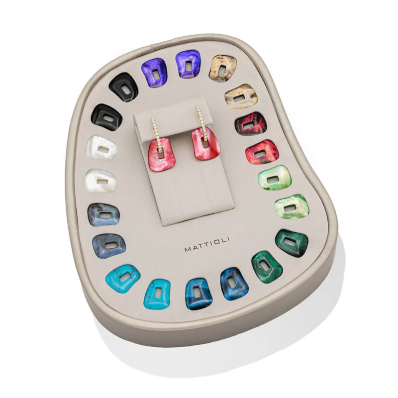 Puzzle Kit - orecchini piccoli in oro giallo, diamanti bianchi e undici paia di Puzzle colorati intercambiabili di Mattioli della collezione Puzzle