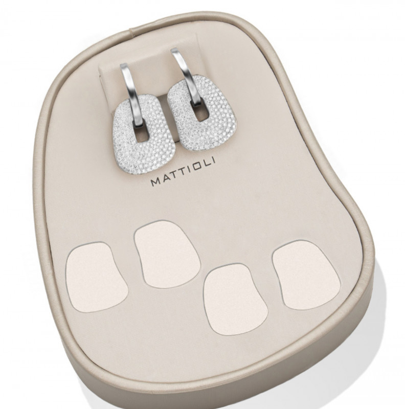 Mattioli medium earrings box in polished white gold, full pavè white diamonds kt. 3,34 and two pairs of colored Puzzles, from Puzzle collection.