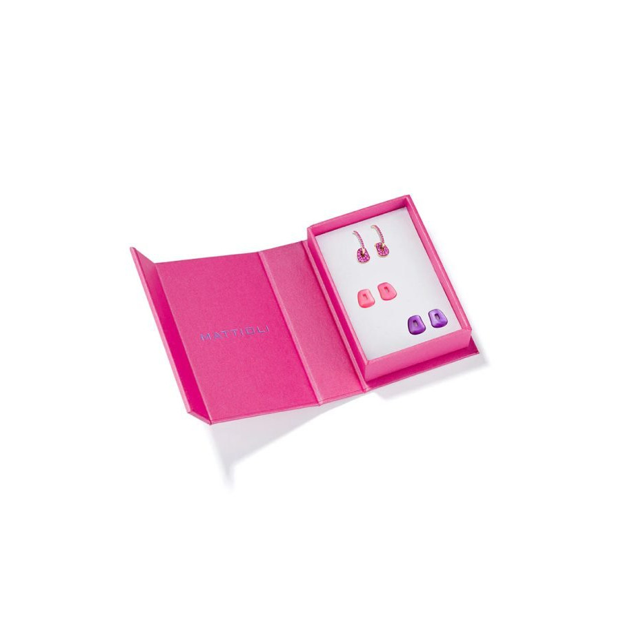 Box Orecchini Mattioli mini in oro bianco 18k, full pavè zaffiri rosa e due coppie colorate di Puzzle intercambiabili, della collezione Puzzle.