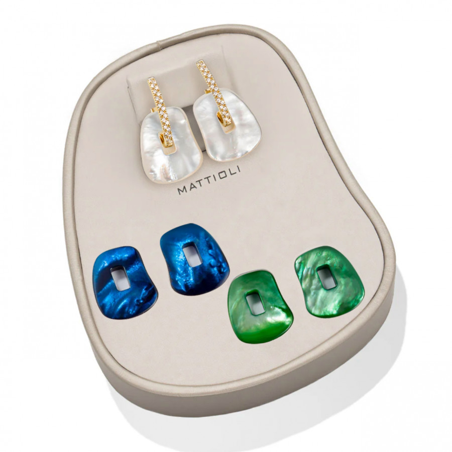 Box Orecchini Mattioli medi in oro giallo 18 kt e diamanti ct. 0.40 e tre coppie di Puzzle colorati della collezione Puzzle
