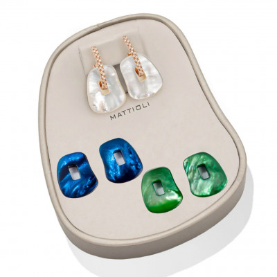 Box Orecchini Mattioli medi in oro rosa 18 kt, diamanti brown 0,40 ct. e tre coppie di Puzzle colorati, della collezione Puzzle