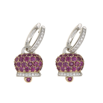 Qui gli orecchini Chantecler Campanelle sono in oro rosa e bianco, con diamanti e pavé di rubini. Oro a 18 kt.