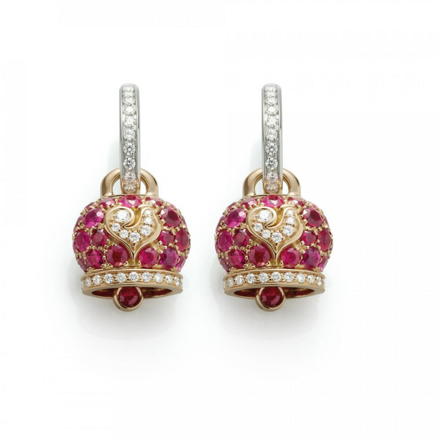 Qui gli orecchini Chantecler Campanelle sono in oro rosa e rubini, con galletto in oro bianco e diamanti bianchi. Oro a 18 kt.