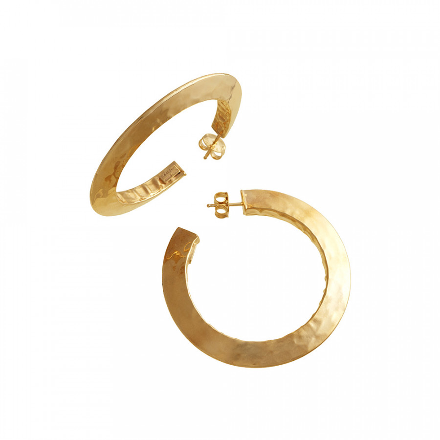 La forma più perfetta, il cerchio. Un metallo martellato e luminosissimo, l'argento dorato. Orecchini che esprimono il connubio ideale tra forza e contemporaneità nello stile Giovanni Raspini. Caratterizzati da linee che disegnano forme decise ed eleganti, vengono realizzati completamente a mano in azienda.