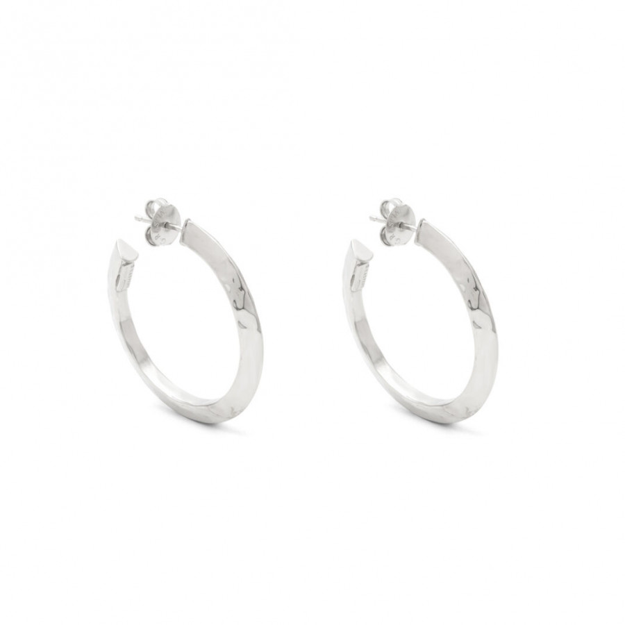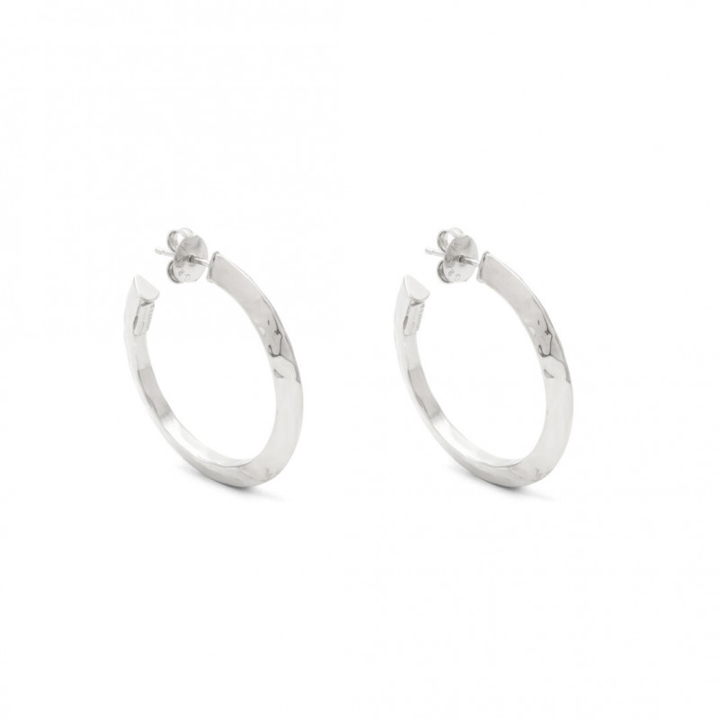 Questi orecchini a cerchio, dalla sezione triangolare e con una texture che riflette una luce intensa, sono parte della collezione Blade. Ogni gioiello è progettato per un look deciso e rock, realizzato in azienda con una lastra d'argento martellata a mano.