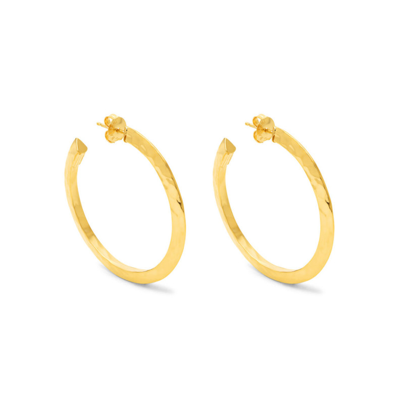 Grandi orecchini a cerchio in argento dorato con una texture che regala una straordinaria lucentezza. Realizzati in azienda con lastra d'argento martellata a mano e successivamente dorati.