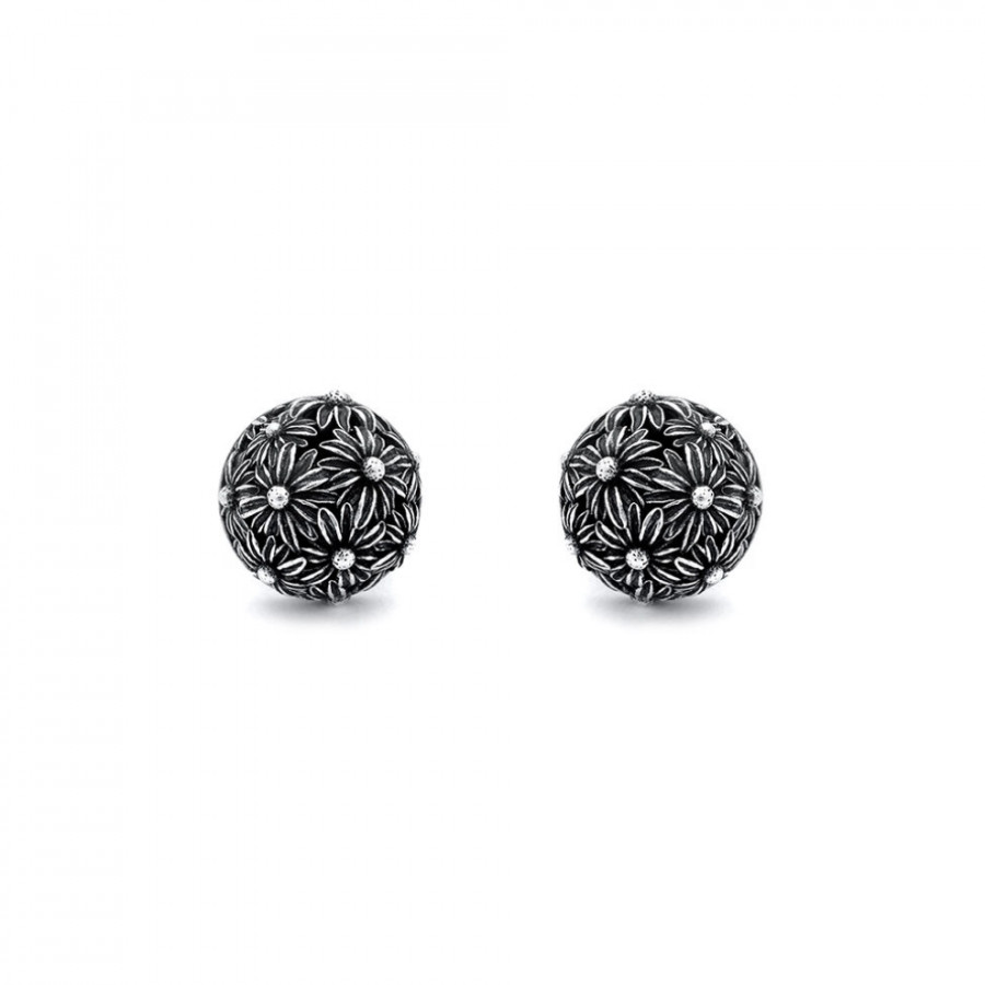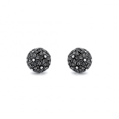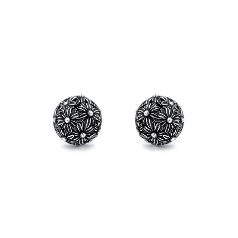 Questi orecchini in argento dalla forma sferica arricchita da margherite in argento brunito, regalano un indosso leggero e prezioso. Eleganti, contemporanei e fatti completamente a mano in azienda.