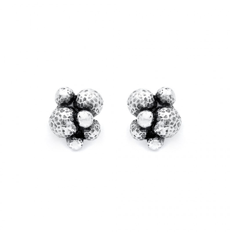 Questi elegantissimi orecchini con modello a bottone raccontano tutto il fascino della fusione a cera persa. Una creazione dalla forte personalità caratterizzata da sferette in argento brunito ad effetto martellato che catturano e riflettono la luce in modo particolarissimo. Fatto a mano in azienda.