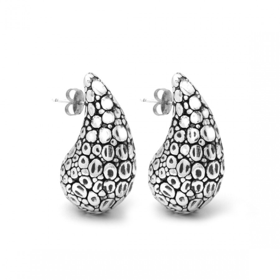 Questi orecchini valorizzano la materia rendendola contemporanea, sviluppando il tema stilistico della goccia d'acqua. Realizzati in argento, vuoti all'interno e quindi leggerissimi, mostrano l'elegante texture di coccodrillo che regala al volto grande luminosità.