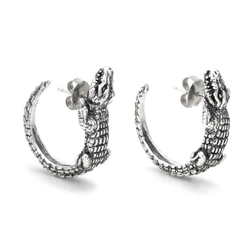 Vere e proprie sculture in miniatura, questi orecchini in argento brunito mostrano un coccodrillo che col corpo crea un elegante cerchio, mentre la testa dell'animale poggia delicatamente sul lobo dell'orecchio. Fatti a mano in azienda.