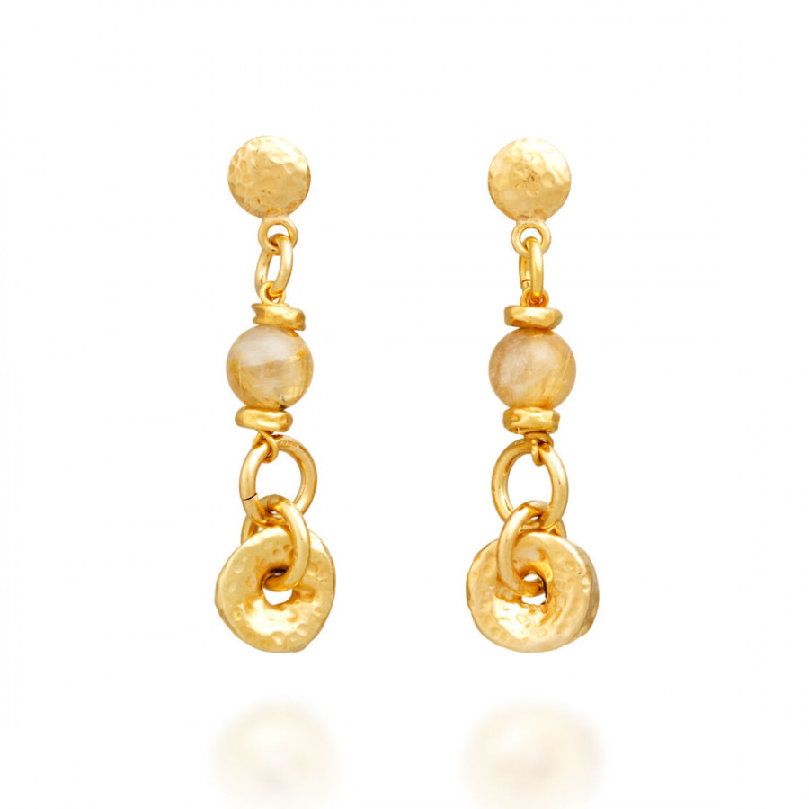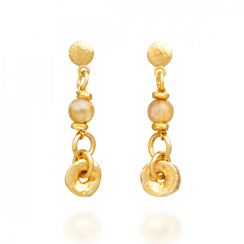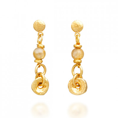 Citazioni classiche per orecchini contemporanei. Eleganti campanelle in argento dorato sostengono due sferette in quarzo rutilato e due elementi a forma di macina, fusi in argento a cera persa e quindi anch'essi dorati.