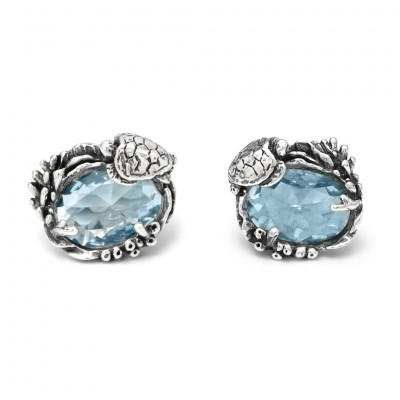 Realizzati completamente a mano, in argento brunito, questi orecchini testimoniano tutto l'amore di Giovanni Raspini per il mondo marino, mettendo insieme tradizione e bellezza. L'argento, fuso a cera persa, incontra la delicatezza coloristica del quarzo color azzurro acquamarina