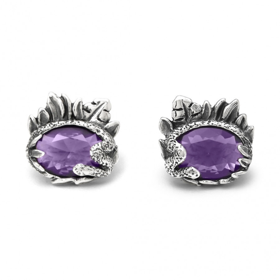 Luminosi e di grande eleganza: questi orecchini a bottone vedono protagonisti due serpenti sinuosi. Tradizione e bellezza dell'argento che incontra la delicatezza del quarzo color ametista.