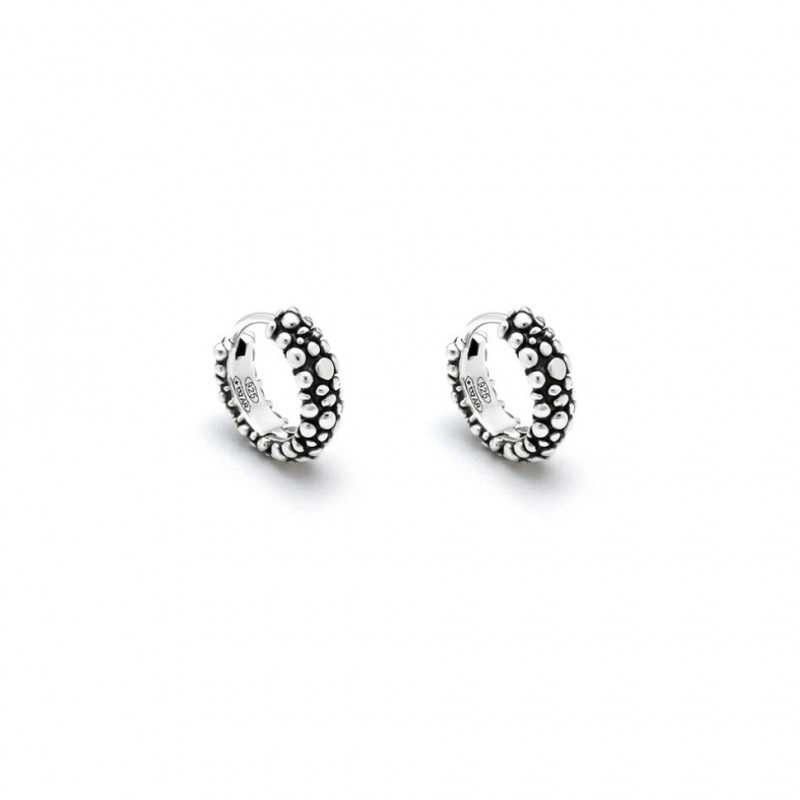 Abbelliti da un decoro Perlage, questi deliziosi orecchini in argento brunito montano una nuova chiusura "a scatto", pratica ed elegante.