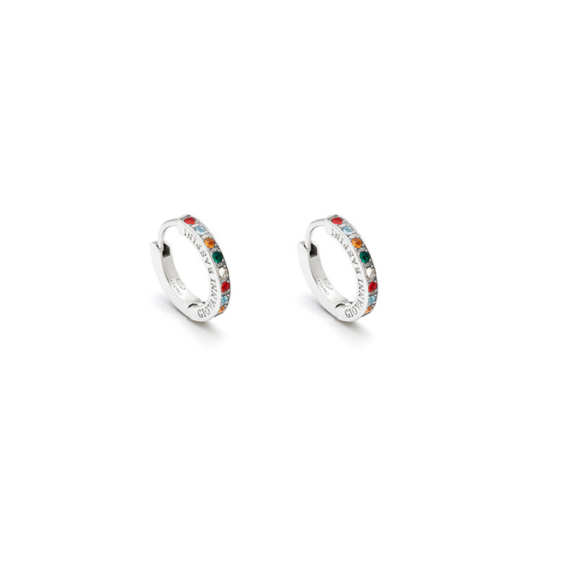 Ornati col decoro di piccoli inserimenti in zircone multicolore, ed istoriati col logo iconico di Giovanni Raspini, questi deliziosi orecchini in argento montano una nuova chiusura "a scatto", pratica ed elegante.