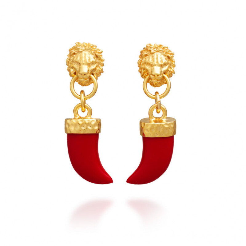 Le teste di leone, fuse a cera persa nell'argento e quindi dorate, sostengono due iconiche zanne in resina ecologica. I nostri orecchini, realizzati interamente a mano in azienda, regalano luce, colore e gioia.