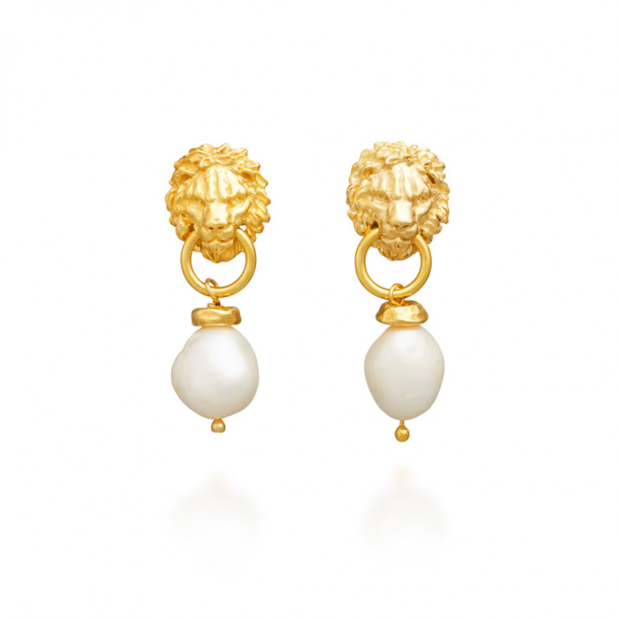 I nostri orecchini, realizzati interamente a mano in azienda, regalano eleganza, colore e gioia. Le teste di leone, fuse a cera persa nell'argento e quindi dorate, sostengono due luminosissime perle barocche d'acqua dolce.