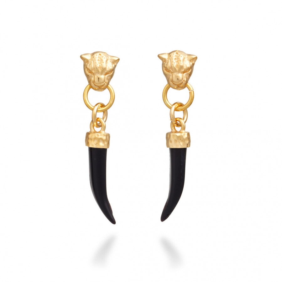 Bellezza animalier per ogni donna, con questi orecchini che regalano luce, colore ed eleganza. Due teste di leopardo, fuse in argento a cera persa e quindi dorate, sostengono ognuna una zanna in vetro nero.