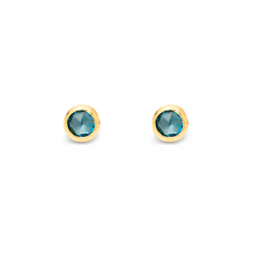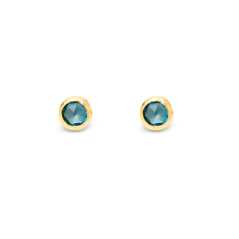 Questi piccoli orecchini a bottone in argento dorato montano due cristalli azzurri, con taglio rotondo schiacciato ai poli, incastonati "a giorno" da una fascetta elegante e minimal. Bellissimi nella loro semplicità, sono realizzati a mano in azienda.