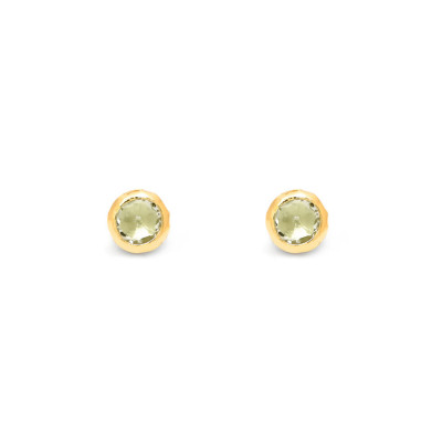 Questi piccoli orecchini a bottone in argento dorato montano due cristalli verde lime, con taglio rotondo schiacciato ai poli, incastonati "a giorno" da una fascetta elegante e minimal. Bellissimi nella loro semplicità, sono realizzati a mano in azienda.