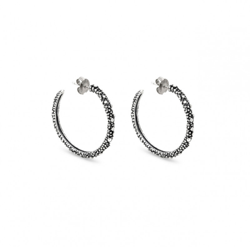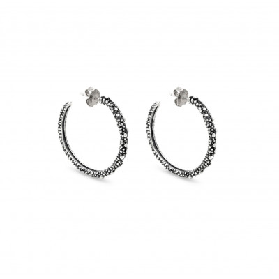 Gli orecchini Cerchio Petit Perlage esprimono l’eccellenza artigianale della fusione a cera persa, celebrata in una forma contemporanea ed essenziale. Il pavé di sferette in argento brunito, finemente diamantato, dona affascinanti giochi di luce.
