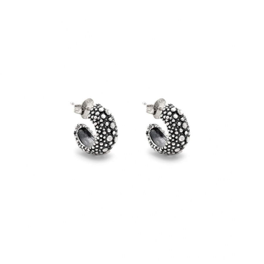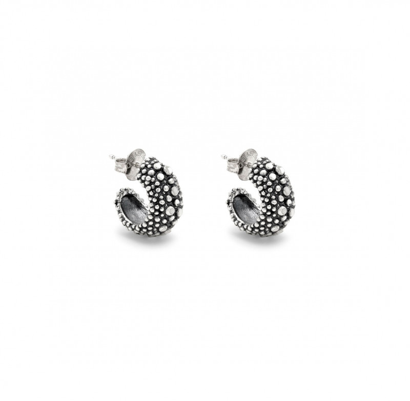 Raffinati e luminosi, gli orecchini Petit Perlage uniscono sapienza artigianale e design contemporaneo. Realizzati con la tecnica della fusione a cera persa, presentano una superficie in argento brunito, animata da un pavé di microsfere finemente diamantate.