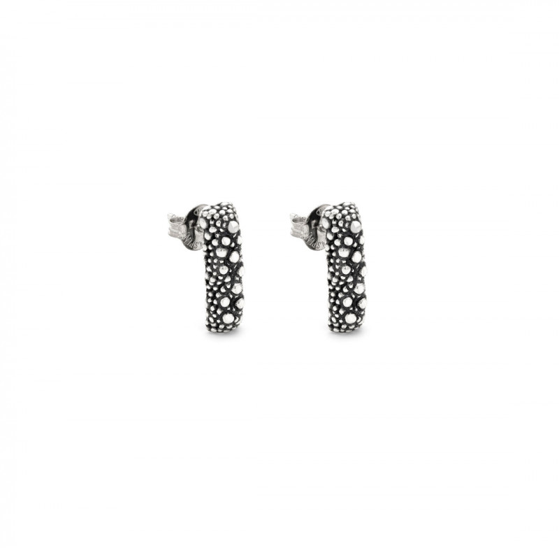 Raffinati e dal gusto senza tempo, gli orecchini Petit Perlage Piccoli celebrano l’arte orafa tradizionale attraverso la tecnica della fusione a cera persa. La superficie è impreziosita da un pavé di micro sferette in argento brunito, esaltato da una diamantatura che cattura e riflette la luce.