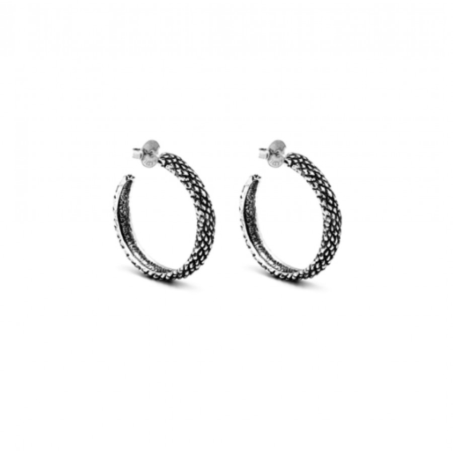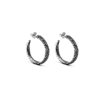 Collezione Serpente - Gli orecchini Cerchio Serpente regalano texture di argento brunito e scaglie lucenti di serpente. Il tema stilistico figurativo viene interpretato in termini contemporanei, realizzando un gioiello luminoso e dal fascino astratto.